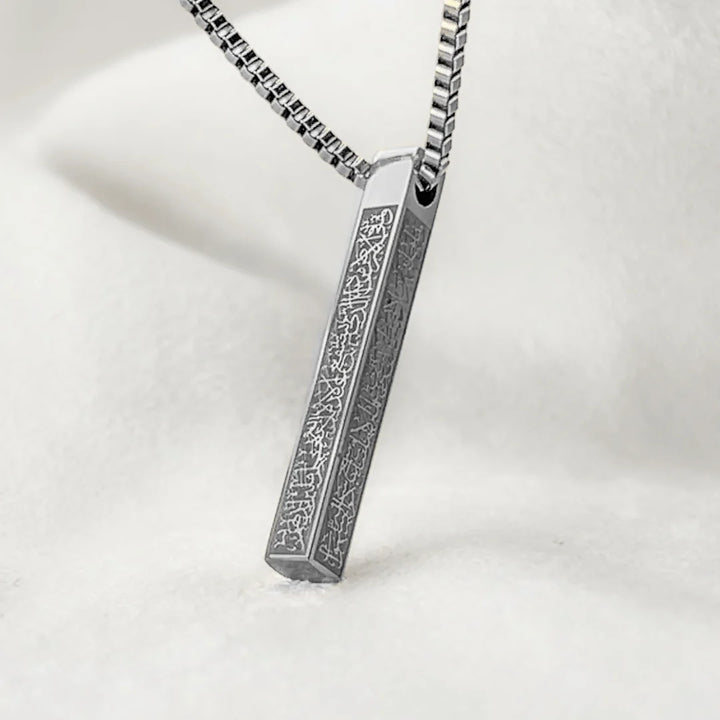 Islamic Gold-Tone Bar Pendant Necklace – A modern vertical pendant engraved with Quranic verses, offering a meaningful blend of faith and style.